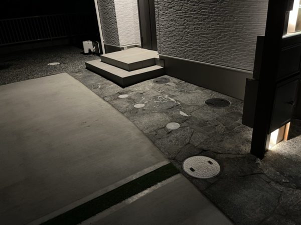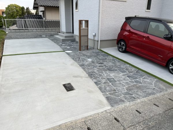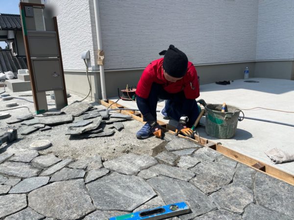 下地コンクリートを打設後、一枚一枚の形、大きさを合わせてバランスよく張っていきます。