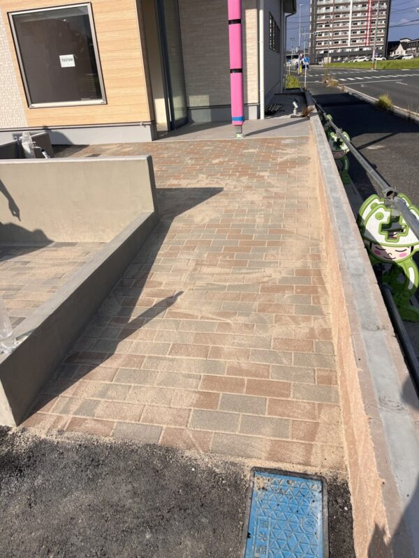 新築外構の仕上げとして、アプローチ部分に耐久性・美観性・機能性を兼ね備えたインターロッキングを採用しました。