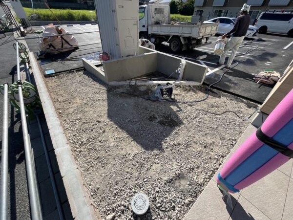 まずは施工前の整地作業からスタート。既存の地盤をしっかり転圧し、不陸(でこぼこ)をなくすことで、長期的に沈下や歪みが起きにくい基礎を作ります。砕石を敷き詰め、再度転圧をかけることで強固な下地が完成。インターロッキングの仕上がり精度は、この下地づくりに大きく左右されるため、特に丁寧に進めました🔨✨